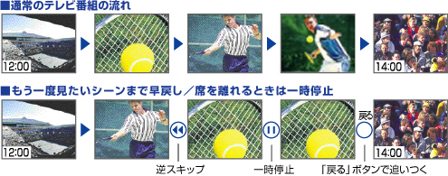 席を離れるときは一時停止、その後「戻る」ボタンで現在の映像に追いつくことが可能です。もう一度見たいシーンへは、「逆スキップ」ボタンで早戻しすることもできます。(注5) |