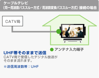 電波の伝送方式を確認してください。同一周波数パススルー方式、周波数変換パススルー方式に対応しています。詳しくは、ケーブルテレビ会社に確認してください。
