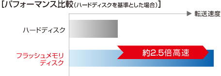 フラッシュメモリディスクは、データの読み書き時に、ハードディスクのような磁気ヘッドの移動がないため、データの転送速度が2.5型ハードディスク(5400回転/分)に比べ、約2.5倍高速に。パフォーマンスが大幅に向上し、動作がとてもスムーズです。