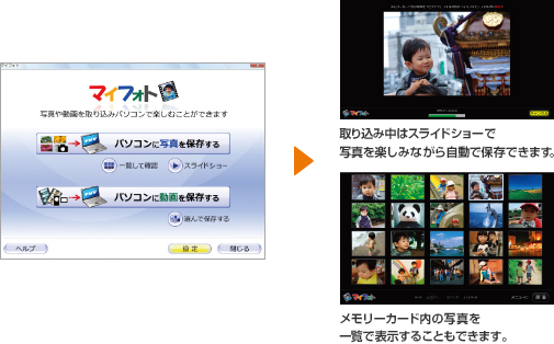 メモリーカードをダイレクト・メモリスロットに差し込むと自動起動。ワンクリックするだけで写真を表示しながら「ピクチャー」フォルダに自動で保存したり、スライドショーを楽しむことができます。