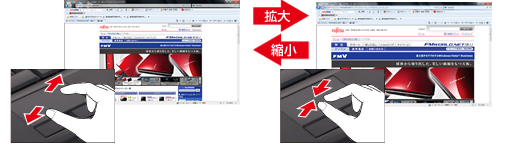 フラットポイント上で2本の指でつまんだりひらいたりする操作をすると、画像やウィンドウ内の画面が拡大や縮小表示されます。