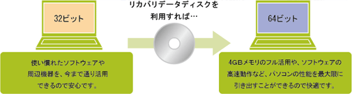 添付のリカバリデータディスクを利用することで32ビットOSから64ビットOSに切り替えることができます。用途や環境に応じてOSを選択できるので将来も安心です。