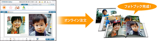 「MyBookEditor」なら、撮りためた写真を使って、レイアウトや背景を決めるだけのかんたん操作で本格的なフォトブックができます。そのままインターネットから申し込めば、素敵に製本されたフォトブックが届きます。(注6)