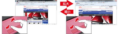 フラットポイント上で2本の指でつまんだりひらいたりする操作をすると、画像やウィンドウ内の画面が拡大や縮小表示されます。