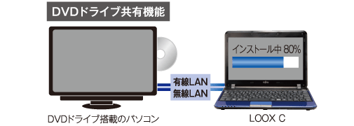 有線/無線LANを経由して、もう1台のパソコン(注1)のDVDドライブを利用することができ、ソフトウェアのインストール作業など(注2)を行うことができます。