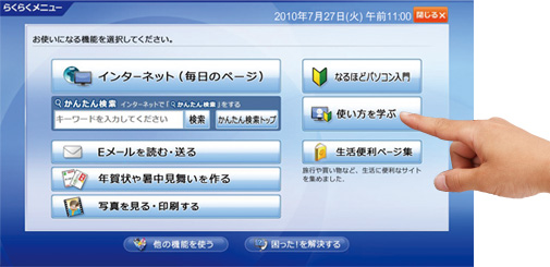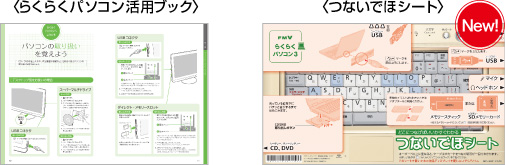 大きな文字で、難しい解説を極力省いた専用マニュアル付き。らくらくパソコンの使い方を楽しく学べます。また、パソコンに重ねて置くと、ケーブルなどをどこにつなげばいいかひと目でわかる「つないでほシート(注1)」も添付されているので安心です。