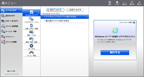 「@メニュー」は、目的に合わせてソフトを探したり、FMVの活用法など、最新情報をいつでも入手できます。