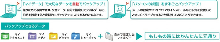| * | 「バックアップナビ」はOSやソフトウェアの不具合に限り、保存したマイデータやPCの状態の復元が可能です。ハードウェアの物理的不具合や故障の場合は復元できません。 | ||||||