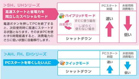 電源ボタンを押すとすぐにPCがスタート、終了できる「クイックスタート」を搭載。使いたいときにパッとPC を使うことができます。モバイル性の高いSH/UHシリーズでは、高速スタートと省電力を両立した「ハイブリッドモード」を搭載。その他のシリーズでも選べる2つのモード(注2)からお客様の使い方に合わせた設定ができます。