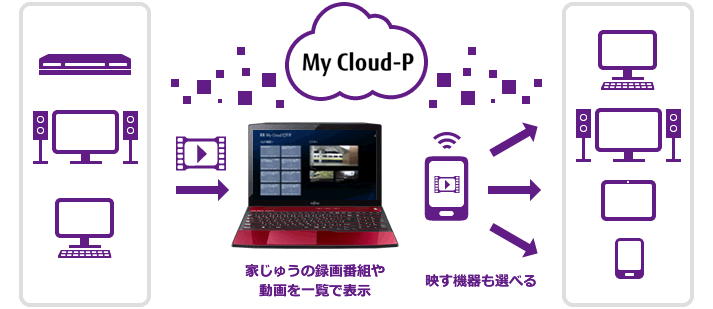 家の中にあるレコーダーやPCなど(ホームネットワーク対応機器)の中にある録画番組や動画コンテンツをまとめて管理します。録画日時や番組名などで一覧表示するので、どの機器に録画したのかは意識せずに、見たい番組を探すだけのかんたんな手順で動画を楽しむことができます。しかも、動画を見ることができる機器はPCだけではなく、手元のスマホや、ホームネットワーク上のTVやタブレットなどを指定して映すことができます。