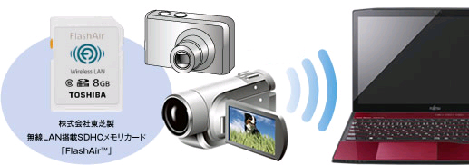 無線LAN搭載SDHCメモリカードFlashAir™を挿入したデジタルカメラ/ビデオカメラ(注3)から、撮影した写真・動画を自動で取り込めます(注2)。デジタルカメラ/ビデオカメラをPCのそばで起動するだけで、自動でPCへデータを転送。メモリーカードの取り外しやケーブル接続などのわずらわしい作業も不要です。