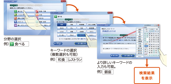 どんな言葉で検索したら良いのかわからない、文字入力が苦手という方にオススメ。表示された言葉から選んでタッチしていくだけで、インターネット上にある知りたい情報にたどり着くことができます。