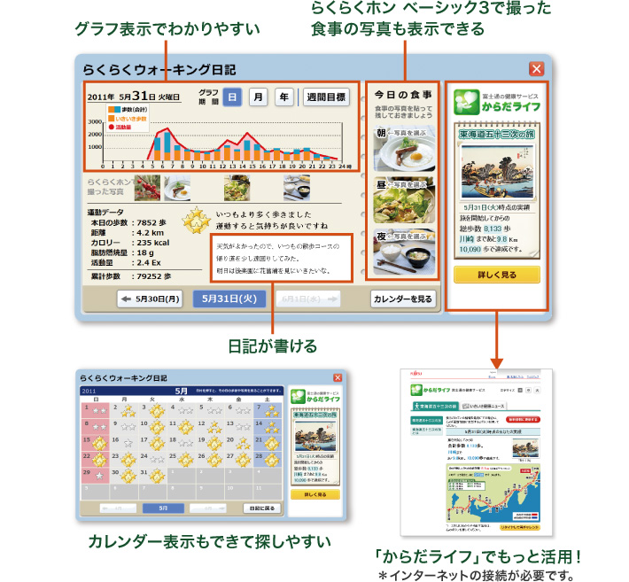 らくらくホン ベーシック3の歩数・距離・消費カロリー・脂肪燃焼量・活動量を、らくらくパソコン4に取り込むことができます。日・月・年単位でグラフ表示でき、毎日の運動量が一目でわかります。