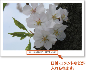 思い出の写真を印刷するときに、日付や場所などの文章を、写真のふちに入れることができます。アルバムの整理にも役立つほか、お友達への素敵なプレゼントにもなります。
