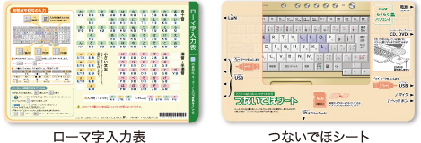 さまざまな場面で役立つローマ字入力表は、パソコンのそばに置いておけば、文字の入力にとても便利です。また、つないでほシートは、パソコンに重ねて置くと、ケーブルなどをどこにつなげばいいかひと目でわかり安心です。
