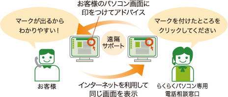 サポート担当者がインターネットを経由してお客様の画面を参照し、電話で操作案内をするサービスです。お客様が「操作がむずかしいな」「自分ではできないな」と感じられたときに、必要に応じてサポート担当者がリモートサポートでの操作案内をご提案します。