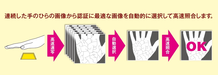 手のひらをタッチさせるような感覚で認証できる世界最小・最薄の非接触型静脈センサーを実用化 高速撮影機能、自動照合機能により、軽快な手のひら静脈認証を実現