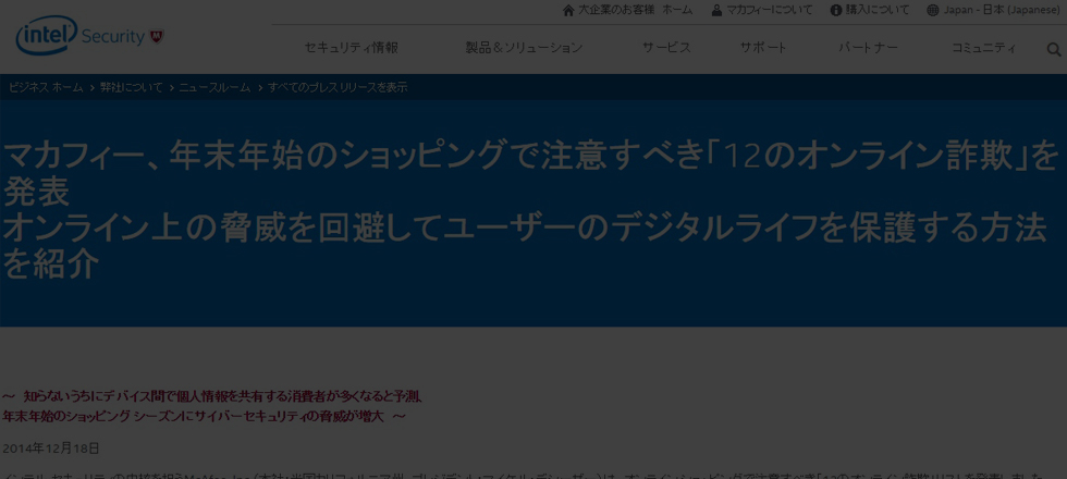 マカフィーは12月18日、オンライン ショッピングで注意すべき「12のオンライン詐欺」リストを発表。デジタルデバイスを利用したショッピングの機会が増加する年末年始に、サイバー犯罪者が消費者を騙す最も一般的な手口に関して注意喚起している