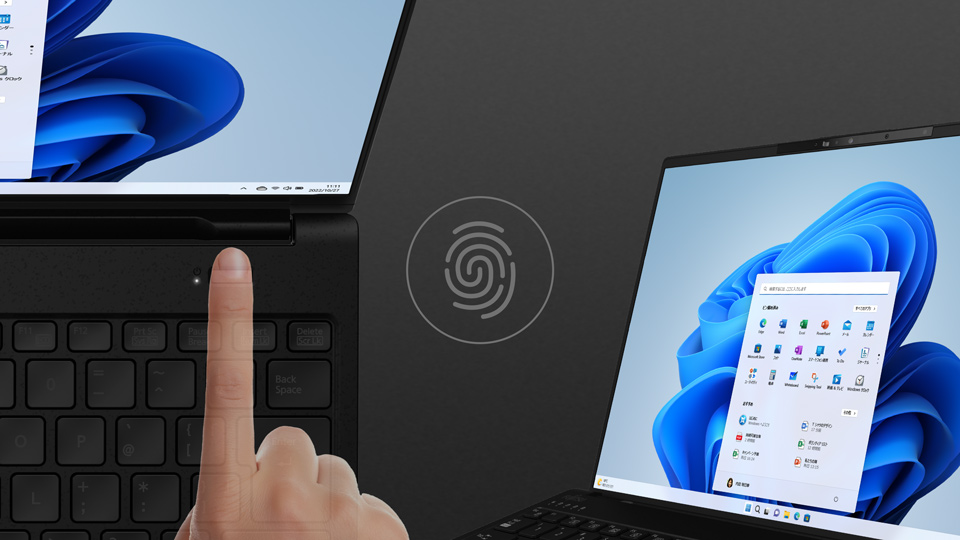 14桁の英字、数字を使った簡単には破れない強固なパスワードを設定しても、パソコンの電源オン時は電源ボタンの指紋センサーが認証、スリープから復帰時は画面を開いた際に顔認証され、本人だけがその強固なパスワードを全く気にすることなく使用できます。