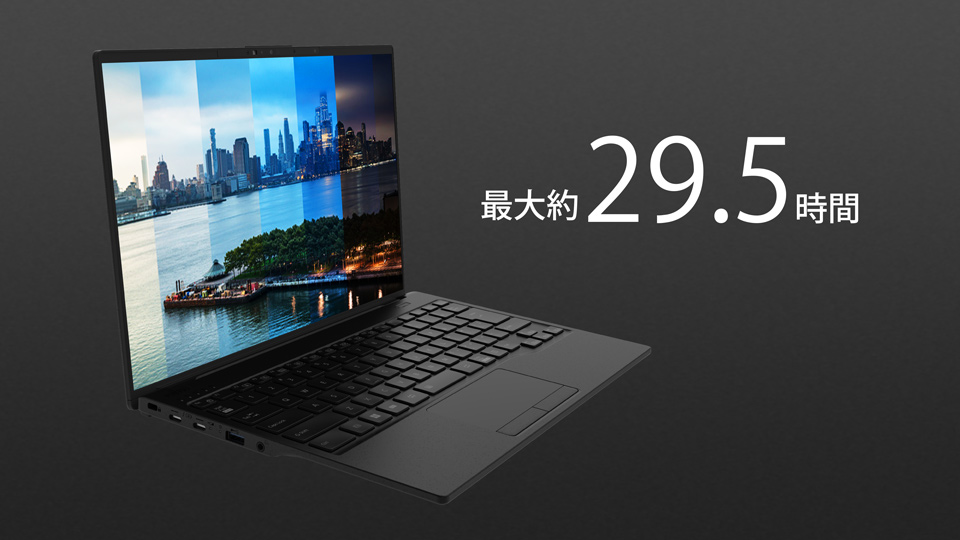 ACアダプターなしで丸一日持ち出せる様に、最大約10.5時間/約28.5時間(動画再生時/アイドル時)駆動(注2)を実現した大容量バッテリーを内蔵しました。