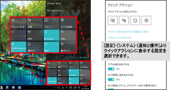 「Windows 10」で「アクションセンター」の機能が一新されました。タスクバーにある「アクションセンター」ボタンをタップすればウィンドウが開き、システムやアプリからの通知を一覧で見ることができます。また、タブレットモードとデスクトップモードの切り替え、無線LANの接続、機内モードのオン/オフなどもこの機能を使って素早く・かんたんに操作できます。