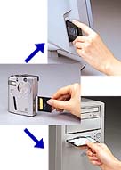 デジタルカメラのスマートメディアやコンパクトフラッシュなどを、PCカードアダプタにセットし、そのままPCカードスロットへ。撮った写真を簡単に取り込めます。 |  |