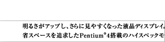| ■快適な処理を実現する、Pentium(R)4+大容量256MBメモリ。 ■快適に使える省スペース&静音設計。 ■場所をとらないコンパクトボディ&スタイリッシュデザイン。 ■"あざやかウィンドウ"対応で、さらに見やすくなった17型ワイド液晶。 ■ワンタッチで新着メールを知らせる"i-Panel(アイ パネル)"。 ■高速インターネットを楽しめるブロードバンドポート。 ■その他の魅力溢れる特徴。 |