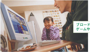 ADSLやCATV、光ファイバー(FTTH)など、従来より高速な回線を使用する、これからのインターネット。映画や音楽ソフト、オンラインゲーム、チャットなどが楽しめます。