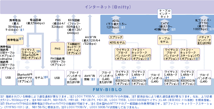 広帯域のデータ転送。ADSL、CATV、光ファイバー(FTTH)などの通信回線を使用することで、動画や音声、ゲームなどの大容量データを高速で配信するサービスを快適に利用できます。また、定額料金のサービスが多く、常時接続での利用が可能となります。 |