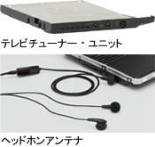 モバイル・マルチベイ構造を利用したテレビチューナー・ユニットを新規に開発。アンテナを内蔵したヘッドホンと組み合わせることで、外出先でもテレビが楽しめます。注1また、RF変換ケーブルを使ってアンテナケーブルをつなげば屋内でもテレビ番組の視聴、録画が可能です。録画した番組はDVDに保存する必要もなくそのまま持ち出せ、外出先でも見られます。