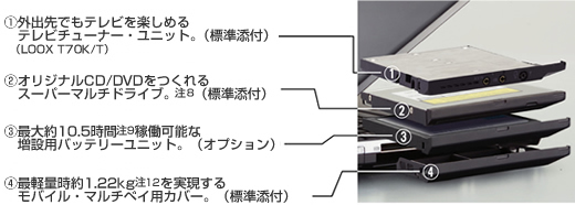 - 注8 LOOX T70K/T、LOOX T70Kのみ。LOOX T50KはCD-RW/DVD-ROMドライブ。
