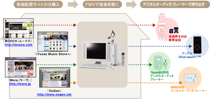 パソコンに取り込んだ曲は「インスタントMyMedia」を使ってすぐに再生できます。注6 注6 対応機種はDESKPOWER全機種(Hシリーズを除く)BIBLO NXシリーズ、NB/TVシリーズ、MG70R/T、MG55R/T、LOOX T70R/T。また、音楽配信サイトなどからダウンロードした著作権保護されたデータは再生できません。 |