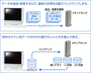 「FMかんたんバックアップ」に登録されているソフトウェアであれば、FMVにデータが追加されたり変更されたりするたびに、自動的にメディアタンク内にバックアップされるので、メディアタンクにも常に最新のデータが保存されます。注4