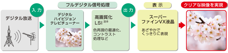 フルデジタル信号処理により、画質の劣化を極限まで軽減。テレビ映像の入力から出力までトータルでの映像美を追求することで、今までにない高画質な映像を表示します。 |