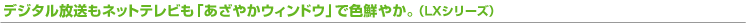 また、LX70Y/D、LX55Y/D、TEO90Y/D、TEO70Y/Dには、BSデジタル・110度CSデジタル放送対応チューナーを搭載。デジタルテレビを思いのままに楽しめます。