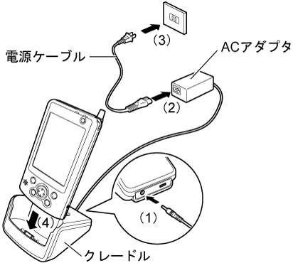 次の図のように、(1)ACアダプタをクレードルに接続したあと、(2)電源ケーブルの片方をACアダプタに接続し、(3)もう片方をコンセントに接続し、(4)本製品をクレードルにセットします。