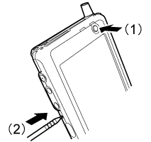 フルリセットを行う場合は、次の図のように、(1)電源ボタンを押しながら、(2)本体左側面のリセットスイッチをスタイラスペンで押します。
