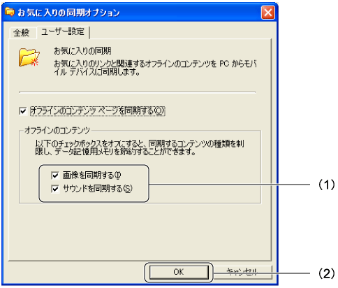 - 「ユーザー設定」タブで、(1)「画像を同期する」と「サウンドを同期する」の