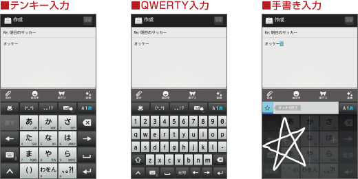 ケータイでおなじみのテンキー入力と、パソコンのキーボードと同じQWERTY入力、記号やアルファベットの切替が不要な手書き入力に対応。自分に合った入力方法を自由に選択できます。