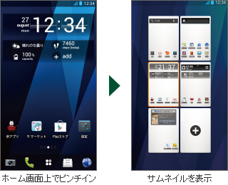 ホーム画面上でピンチイン操作をすることで、ホームアプリの全ページをサムネイル表示。ページの表示順入替や、移動、削除がカンタンに行えます。