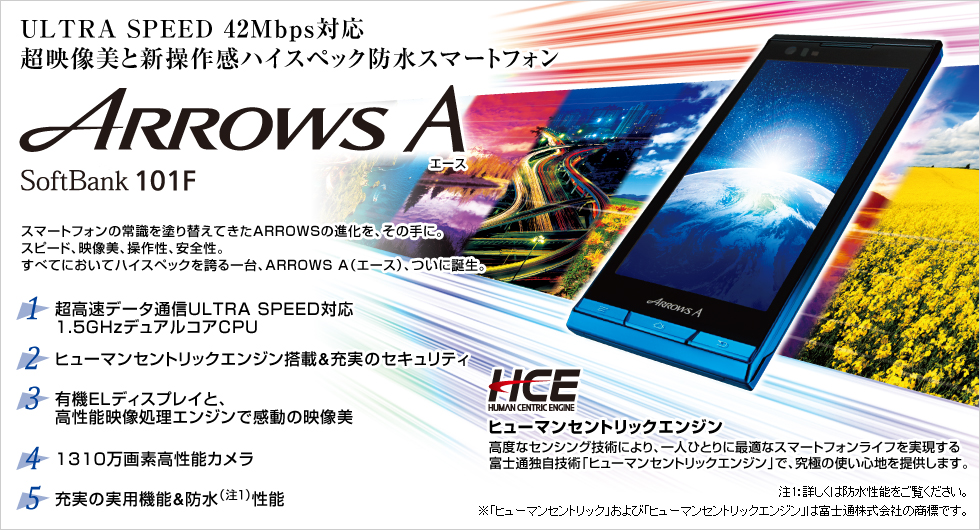 スマートフォンの常識を塗り替えてきたARROWSの進化を、その手に。スピード、映像美、操作性、安全性。すべてにおいてハイスペックを誇る一台、ARROWS A(エース)、ついに誕生。