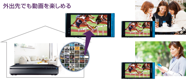 ブルーレイディスクレコーダー(注3)で録画した地デジ番組をワイヤレスでARROWS Aにダビングして外出先でも視聴可能。いつでもどこでも最大720p(注4)の高画質な映像が楽しめます。