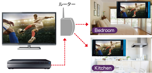 DLNAに対応しているブルーレイディスクレコーダー(注5)などと連携して、録画した地デジ番組(注6)を最大ハイビジョン画質でストリーミング視聴することが可能。家中どこでも視聴できるので、部屋ごとにテレビやレコーダーを置く必要がなくなります。