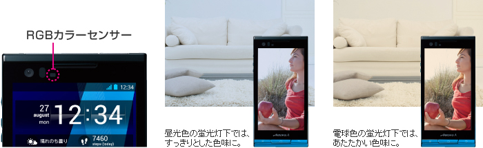 蛍光灯、電球、太陽光など、RGBカラーセンサーで周囲の光の状況を測定し、画面を自然な色味に調整します。
