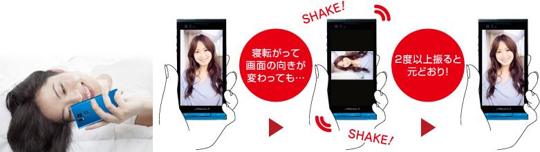 意図せずに画面の向きが変わってしまっても、2度以上振るとカンタンに元の向きに戻すことができます。例えば、寝転がって使う時に勝手に画面の向きが変わってもすぐ戻せます。