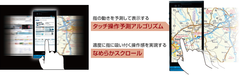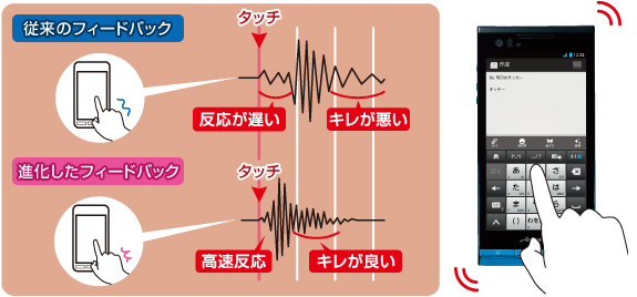 画面にタッチした瞬間に振動を伝達。タッチと振動のズレがないから、操作している感覚が、より分かりやすくなります。