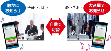 歩行・走行状態や周囲の環境を自動判別。静かな場所では着信音量を小さく、歩行中や騒がしい場所では大きくしてお知らせします。