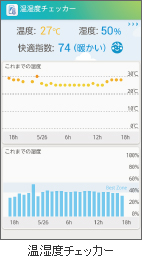 今いる場所の温度や湿度を測定。数値をもとに、快適指数や熱中症、インフルエンザへの注意など、暮らしに役立つアドバイスを表示します。