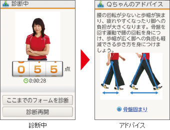 マラソンランナーの高橋尚子さんが監修したウォーキングとランニングのフォーム診断で、あなたに適切なアドバイスを表示し、毎日の運動をサポートします。