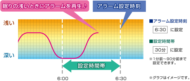 加速度センサーとマイク(音響)を使い、睡眠中のからだの動きや呼吸から、眠りの状態を検知。眠りが浅いときにアラームを鳴らしはじめ、スッキリ快適な目覚めを促します。